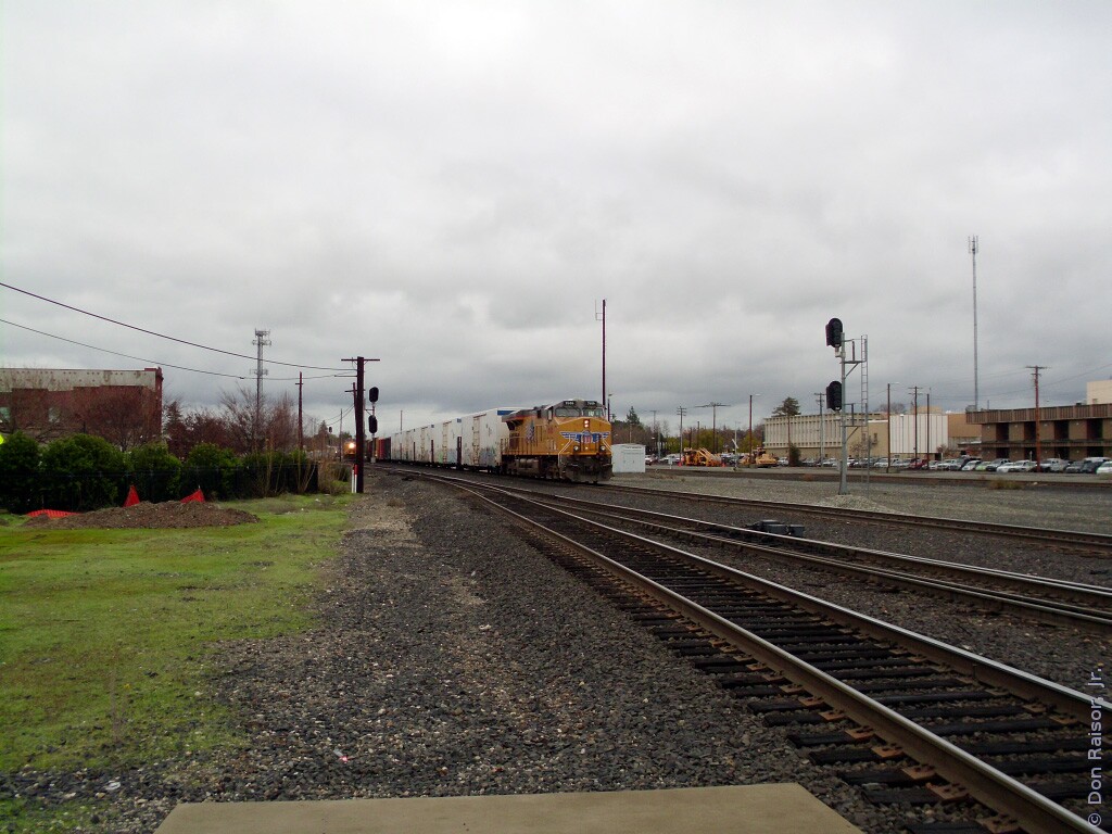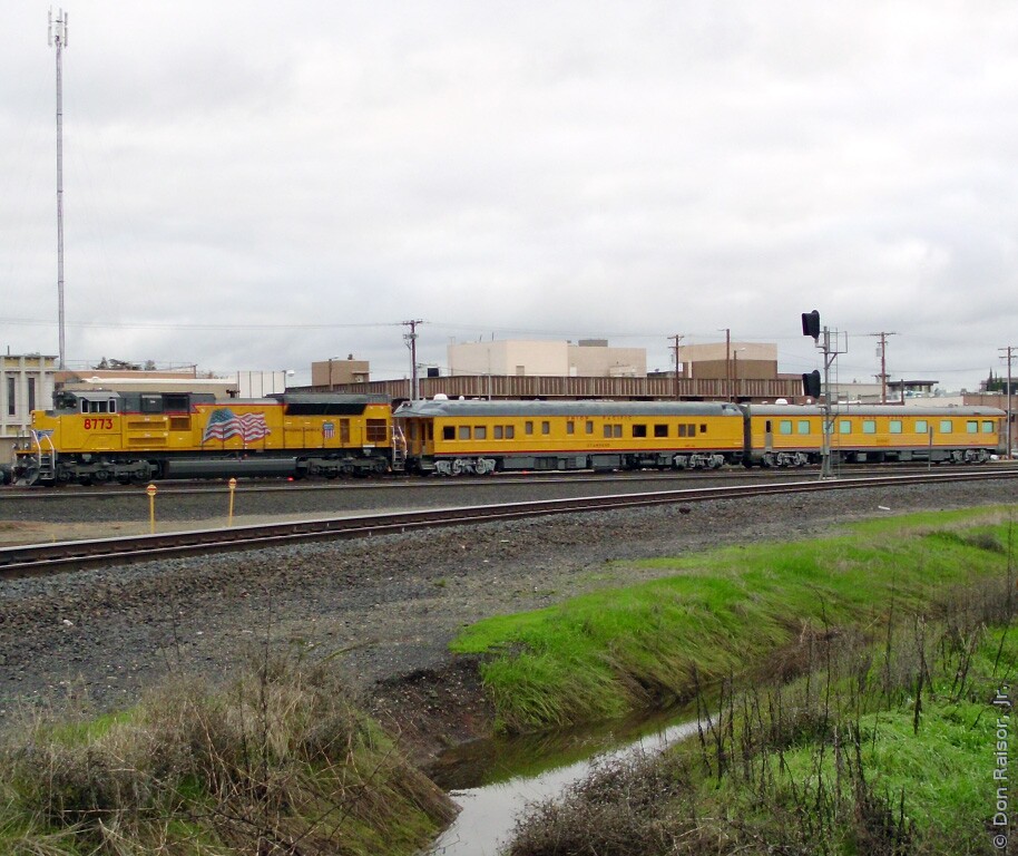 A mixed freight heads east on mainline track two while light power moves on mainline track one. UP8773 is in the background.