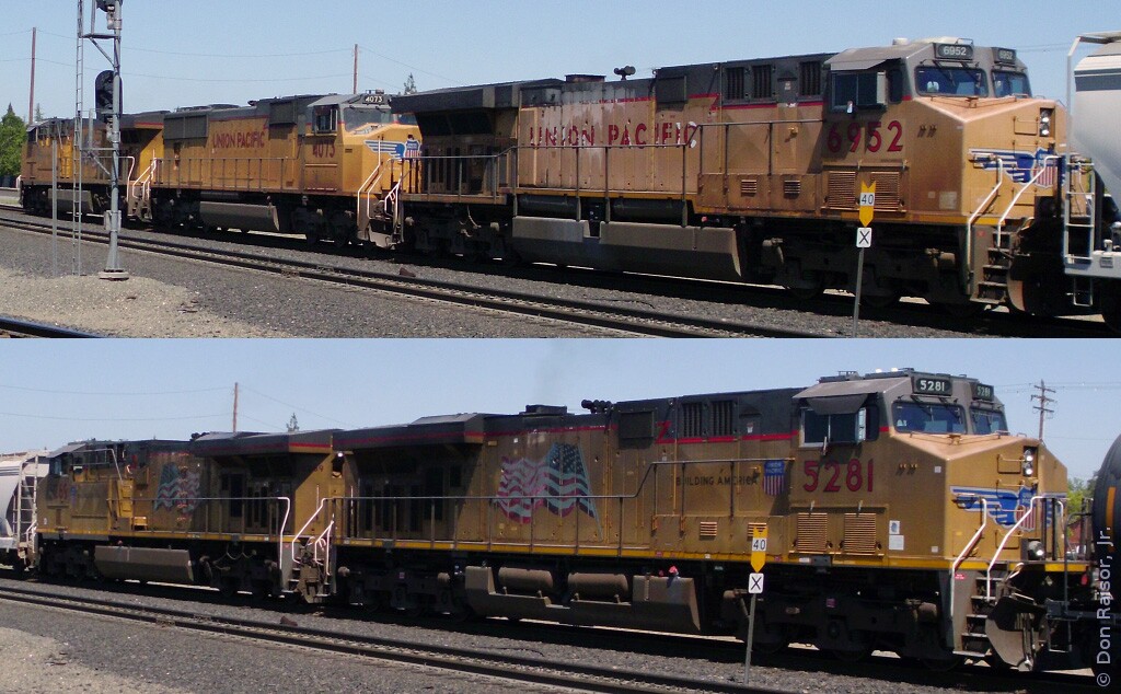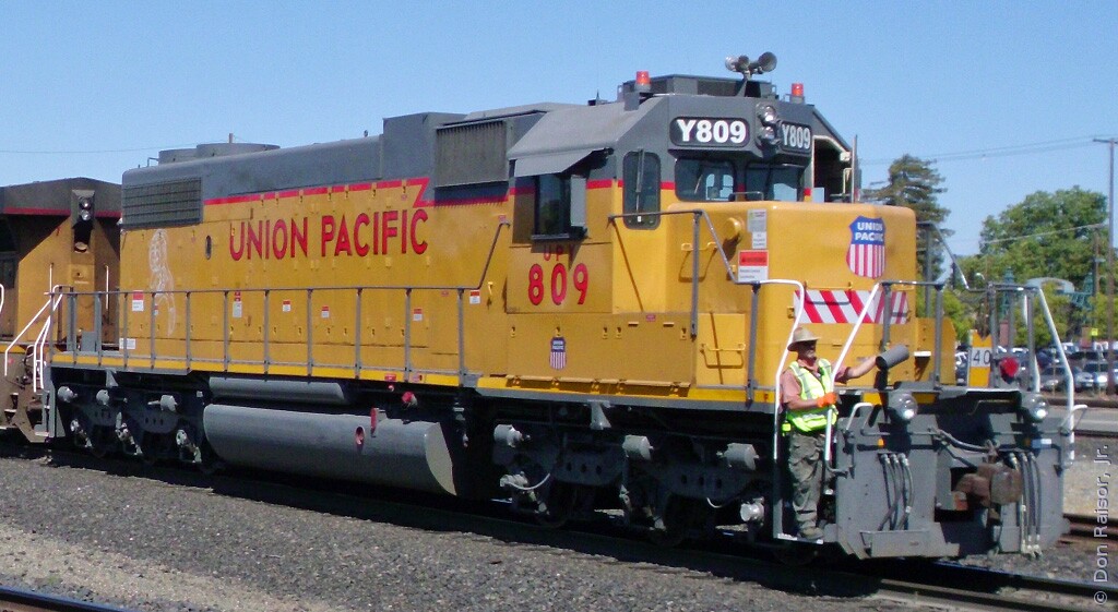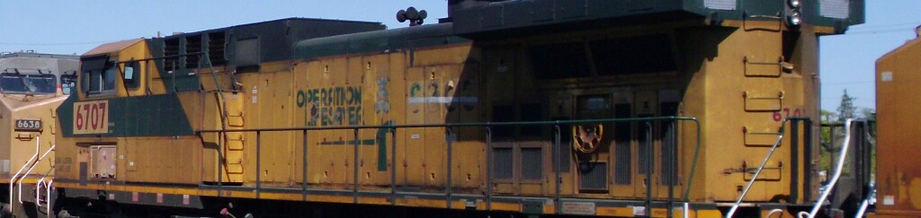 Look, listen and live it says on the side of the cab of this patched former Chicago and North Western locomotive. Operation Lifesaver