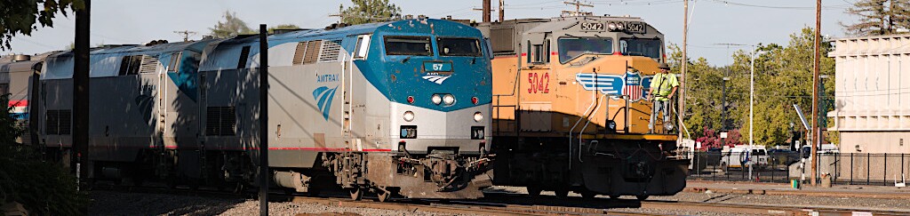 Amtrak's California Zephyr number five meets light power, that has been waiting for it to pass by, just moments before making its Roseville stop.