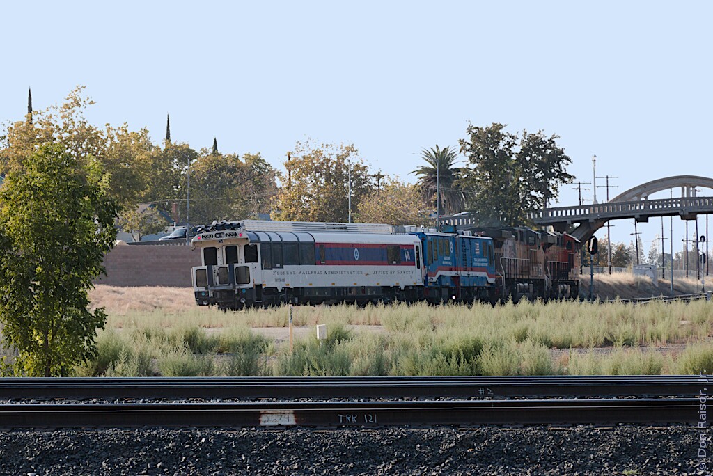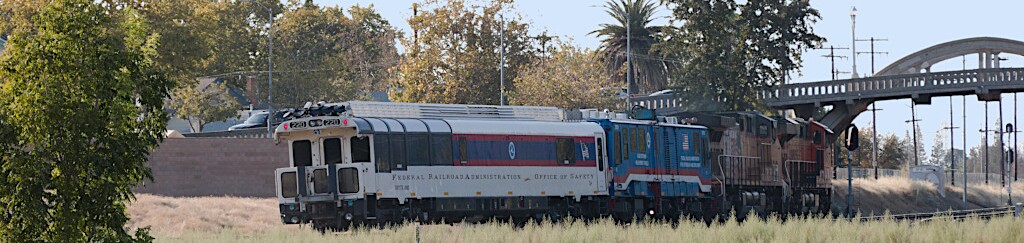 This inspection train is using the wye to turn around and then it will be tied down on a spur. Both DOTX218 and DOTX220 are from the Federal Railroad Administration - Office Of Safety.
