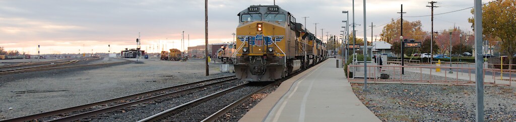 An A-train heading east on the Roseville Subdivision. - A slow moving manifest stops for a crew change at an unusual spot for an eastbound train. - A late California Zephyr number five makes its stop, followed almost immediately by an eastbound intermodal.