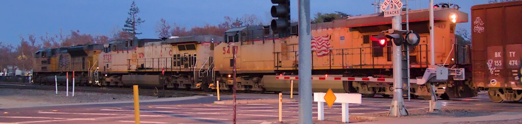 A light power move, with UP5402 and another unidentified locomotive, is waiting for the signal to change.