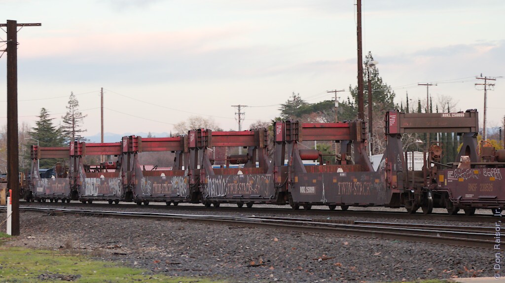 I've said it before, and I'm saying it again: You don't see well cars with bulkheads much anymore. This well car is a Gunderson Twin Stack.