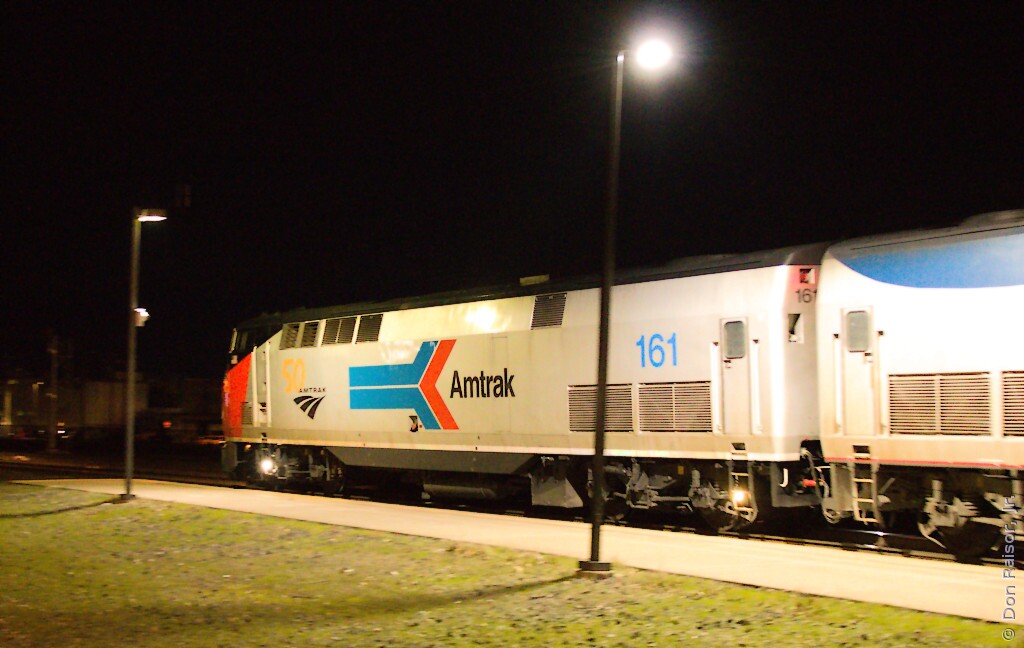 Phase I color scheme - 50th Anniversary Heritage Unit. -- Amtrak's California Zephyr number six is coming to a stop at the platform, running several hours late. It got a late start at Emeryville, CA, "Due to the late arrival inbound equipment."