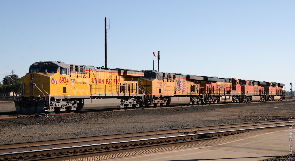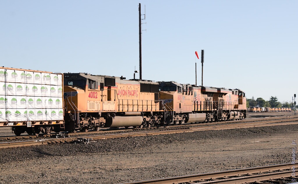 Union Pacific's heritage unit paying tribute to the fallen flag Western Pacific is part of a light power move heading for the wye.