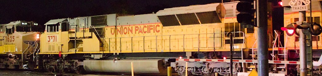 UP7923 and UP7625 are pulling an E-train with six dead-in-tow SD9043ACs. The crew were calling this eastbound train an E-move.