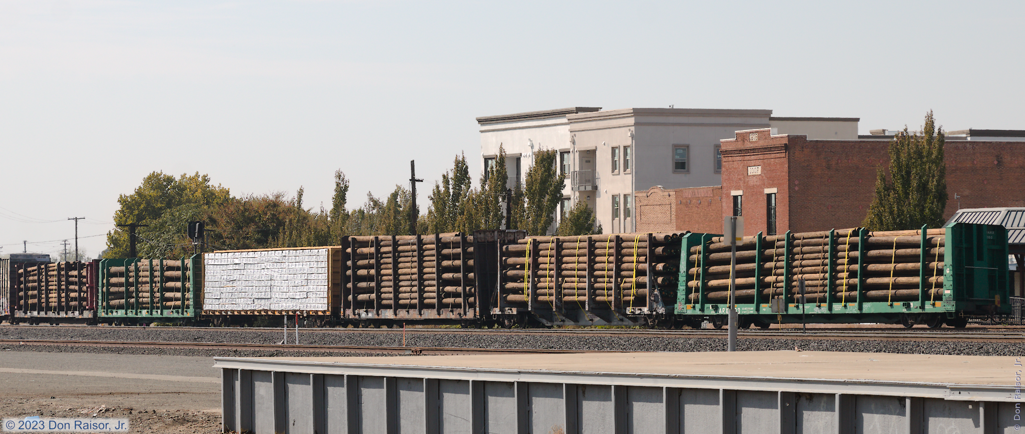 The log cars are carrying either utility poles or piles. JTSX54030 is an excess height flatcar. Note the white paint at the top of the bulkhead, where it says "excess height." (Not readable in this reduced image size.)