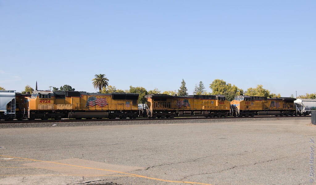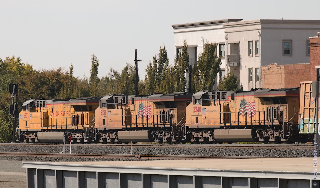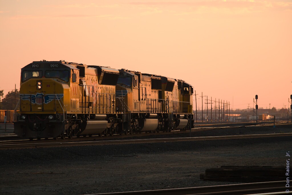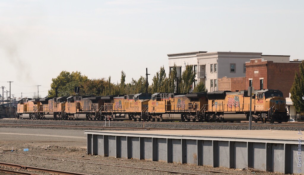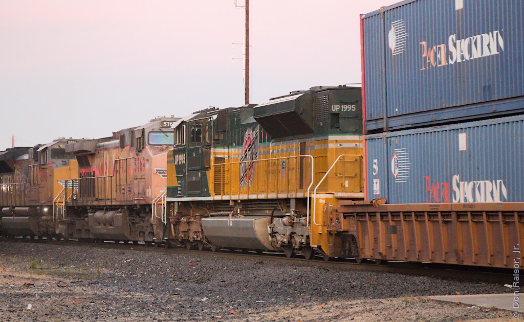Union Pacific's heritage unit paying tribute to the fallen flag Chicago and North Western. UP5769 and UP1995 are dead-in-tow.