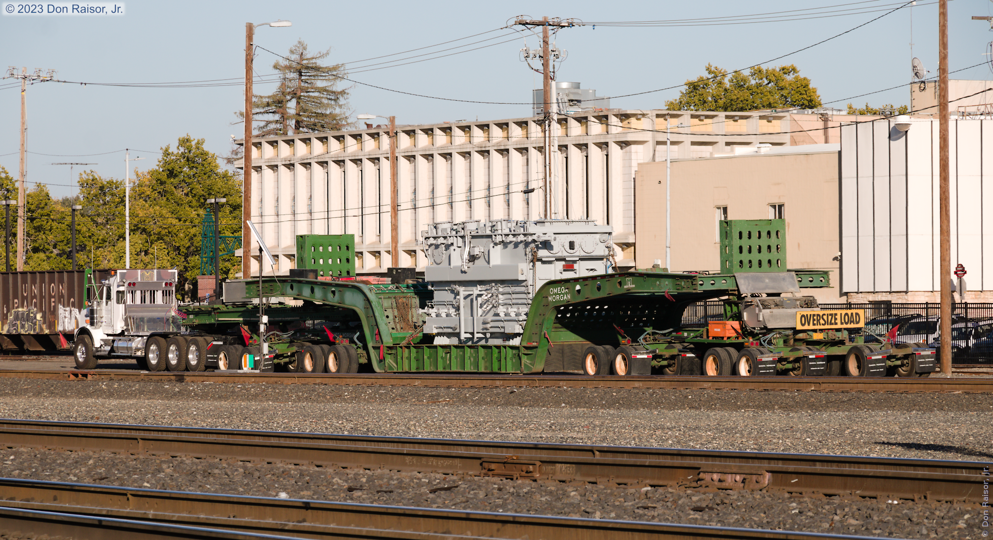 The duel lane trailer that I photographed on September 27, 2023, when it was empty, finally has its load and is being prepared for its journey. Notice how this trailer can lift its bed above its own wheels.