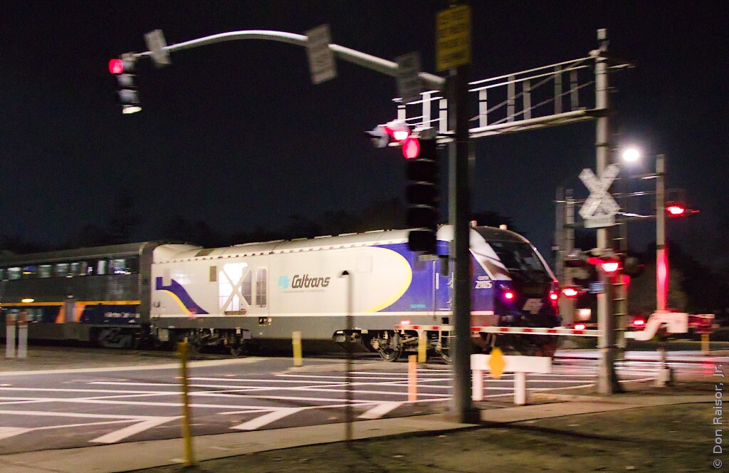 Amtrak California's Capitol Corridor 538 is leaving Roseville. Next stop is Rocklin, followed by Auburn. The train is in push mode.