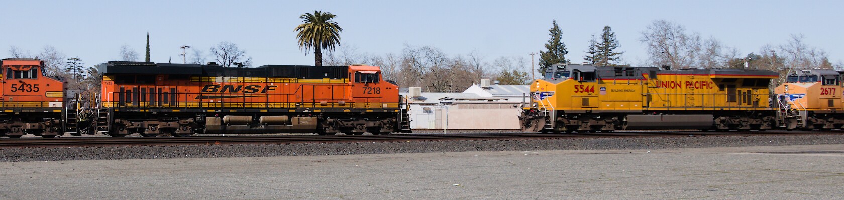 An eastbound BNSF mixed manifest meets a westbound Union Pacific mixed manifest.