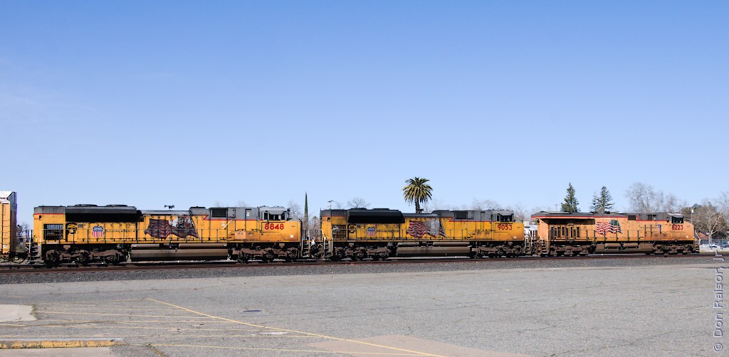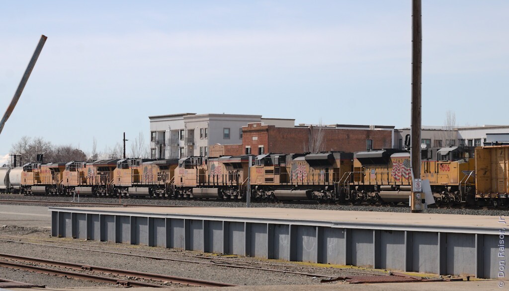 UP6399 is leading a long, empty, grain train.