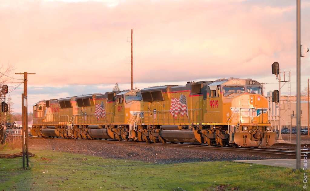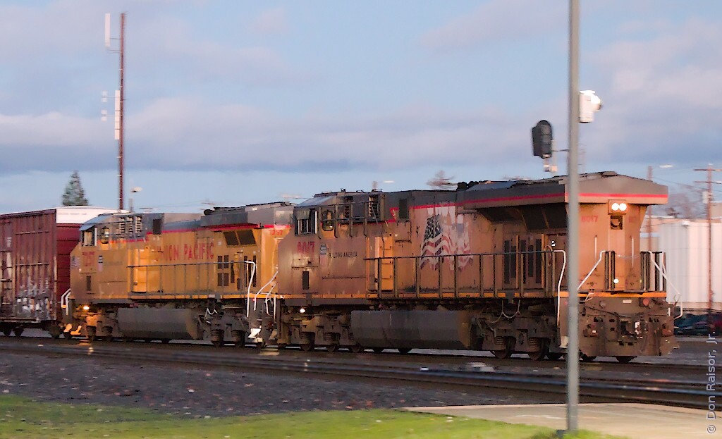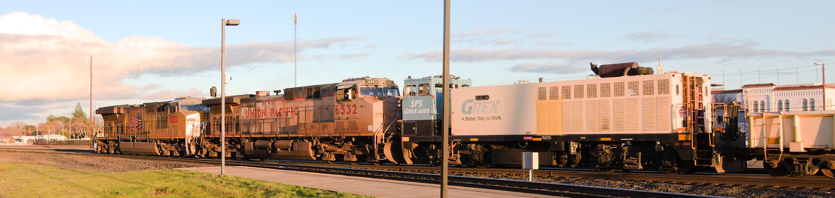 The two Union Pacific locomotives are pulling a self-powered slot machine. The Georgetown Rail Equipment power unit (GREX6005) is dead-in-tow. A slot machine mobile work platform is an articulated gondola with an onboard excavator designed for rapid unloading; it is used in maintenance-of-way operations. A self-powered slot machine includes a power unit with the articulated gondola and is considered one piece of equipment, thus there is one reporting mark for the entire setup.