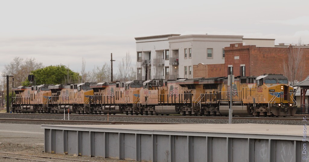 Photographs of locomotives, trains and other railroad equipment, mostly in the vicinity of the J. R. Davis Yard in Roseville California.