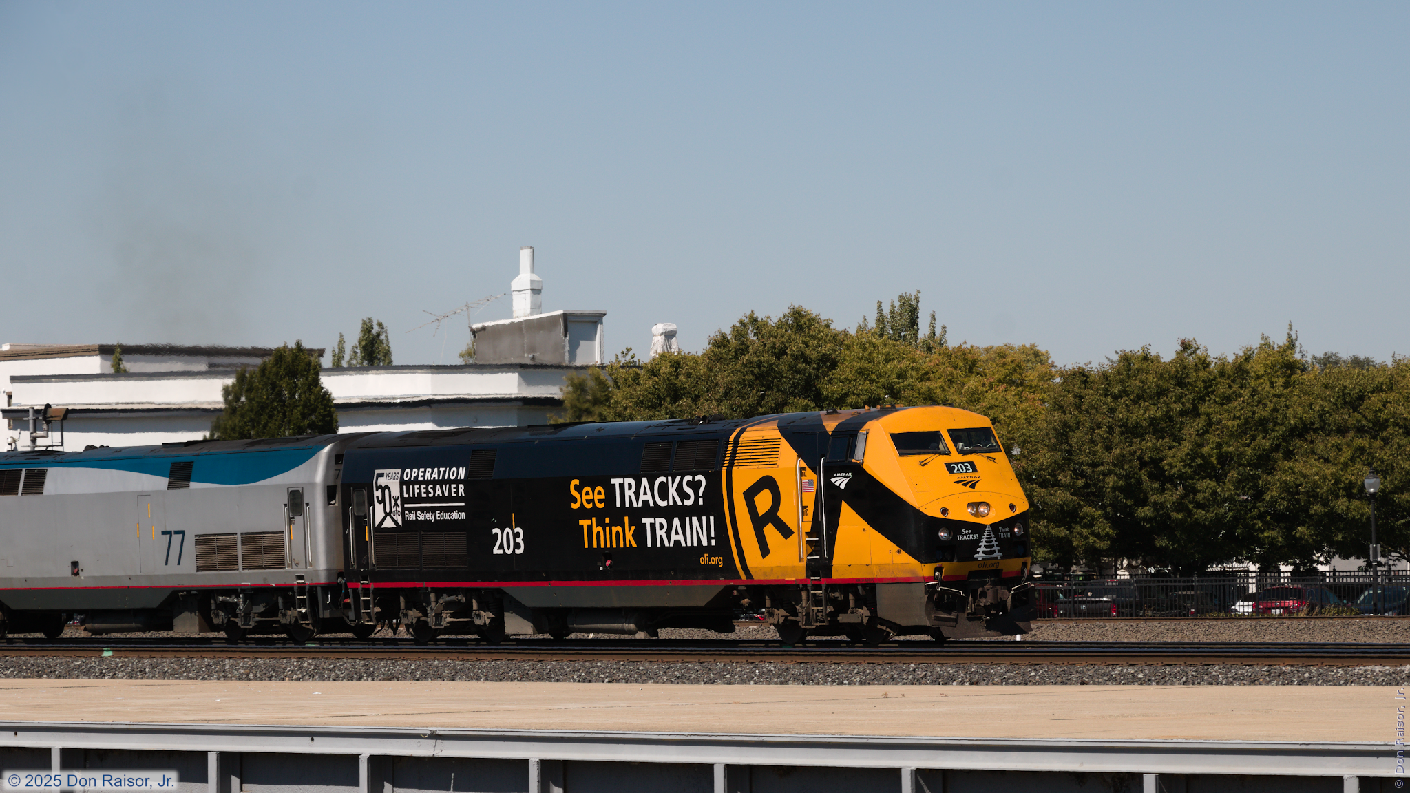 AMTK203, wearing the Operation Lifesaver fiftieth anniversary paint scheme, is leading California Zephyr number six with two brand new ALC42s.