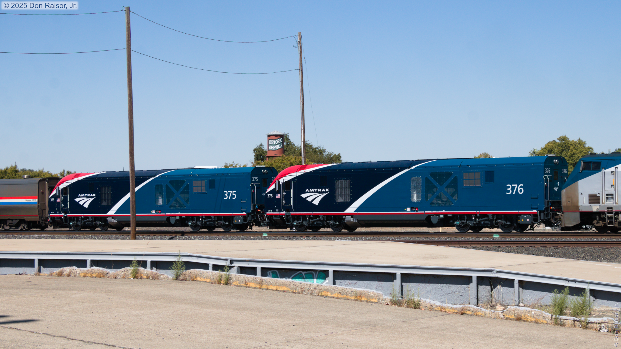 California Zephyr number six with the Operation Lifesaver fiftieth anniversary unit AMTK203 and two new Siemens ALC-42 locomotives. https://oli.org - This Z-train was delayed because it triggered a high-wide load detector near Rocklin, California. - A slow mixed manifest and a hi-rail vehicle. - A loaded grain train. - MWCRV's power followed by a mixed manifest. (MPDRVB) - Another mixed manifest. (MSPRV) - A loaded Canadian grain train. - California Zephyr number five with private rail cars Promontory Point and Suitsme.