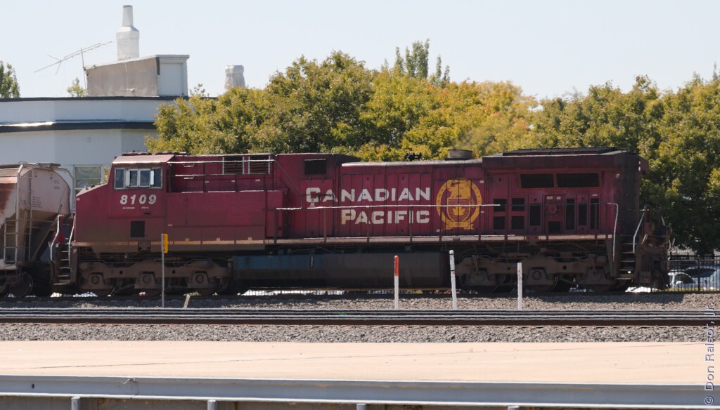 A loaded grain train, presumedly with Canadian grain, is arriving off of the Valley Subdivision.
