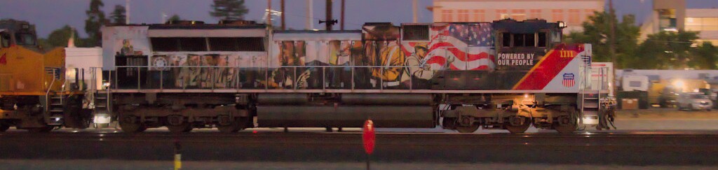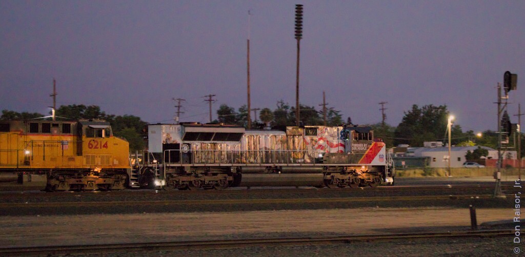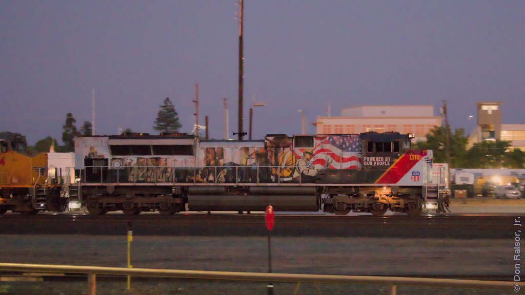 UP1111, Union Pacific's employee pride locomotive, is leading MPDRV into the yard. This train was delayed just before reaching Roseville because of a hot bearing alarm.