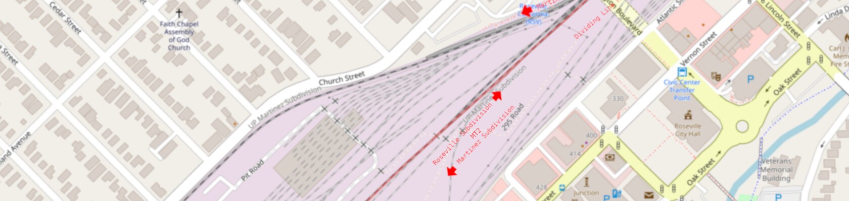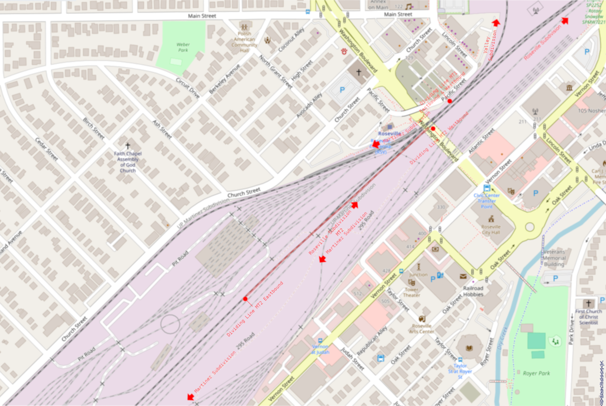 References: Google Maps satellite and aerial images, Union Pacific Roseville Area Timetable #8, and my own photographs.